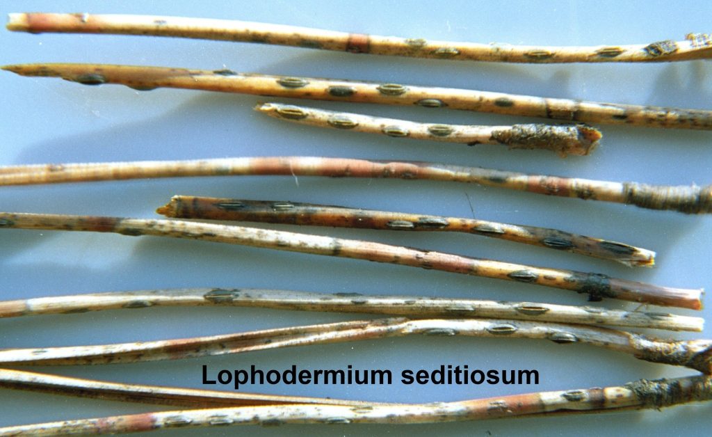 🟡Шютте хвої сосни справжнє (інколи цю хворобу ще називають шютте весняне). Збудник – гриб Lophodermium seditiosum. В кінці жовтня – на початку листопада на заражених хвоїнках появляються невеликі жовті плямки. Весною після танення снігу добре помітно уражену хвою, яка набуває червоно-бурого кольору. На поверхні хвої формуються чорні крапочки (конідіальне спороношення), а потім видовжено-еліптичні із загостреними кінцями органи сумчастого спороношення (апотеції). Апотеції темно-сірого кольору, мають довжину 0,7-1,5 мм. Уражена хвоя відмирає та осипається. Загалом період активності гриба припадає на весняний період. Найчастіше уражає молоді деревця (сіянці, саджанці, молоді лісові культури), на яких пошкоджує молоду (цьогорічну) хвою.