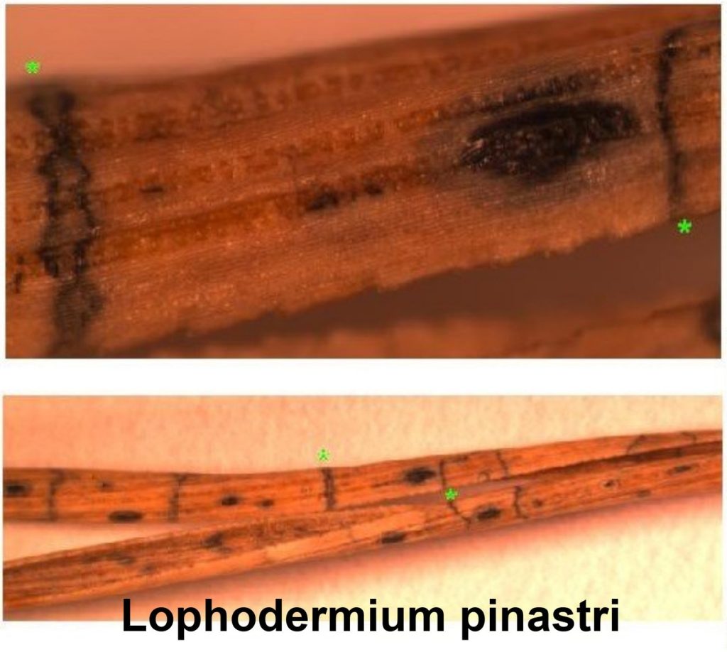 🟡Шютте хвої сосни звичайне (часто ще називають – осіннє шютте хвої сосни). Збудник хвороби – гриб Lophodermium pinastri. Перші ознаки ураження можна помітити вже у вересні – на хвої появляються жовті поперечні смужки, поступово хвоїнки набувають жовто-червоного або жовто-коричневого кольору. Протягом осені та зими всі уражені хвоїнки стають червоно-коричневого кольору, тому найбільш виразно хворобу видно в травні. На поверхні хвої появляються чорні або темно-сірі дрібні крапочки пікніди (конідіальне спороношення). В квітні-травні осипається переважна більшість ураженої хвої, решта опадає протягом літа. На опалій хвої утворюються органи сумчастого спороношення – чорного кольору апотеції довжиною 0,5-1,5 мм. Вони видовжені, еліпсоподібні, із заокругленими вершинами (на відміну від загострених вершин у попереднього виду), між ними видно тонкі чорні звивисті поперечні лінії. Цей патоген уражає хвою дерев сосни різного віку.