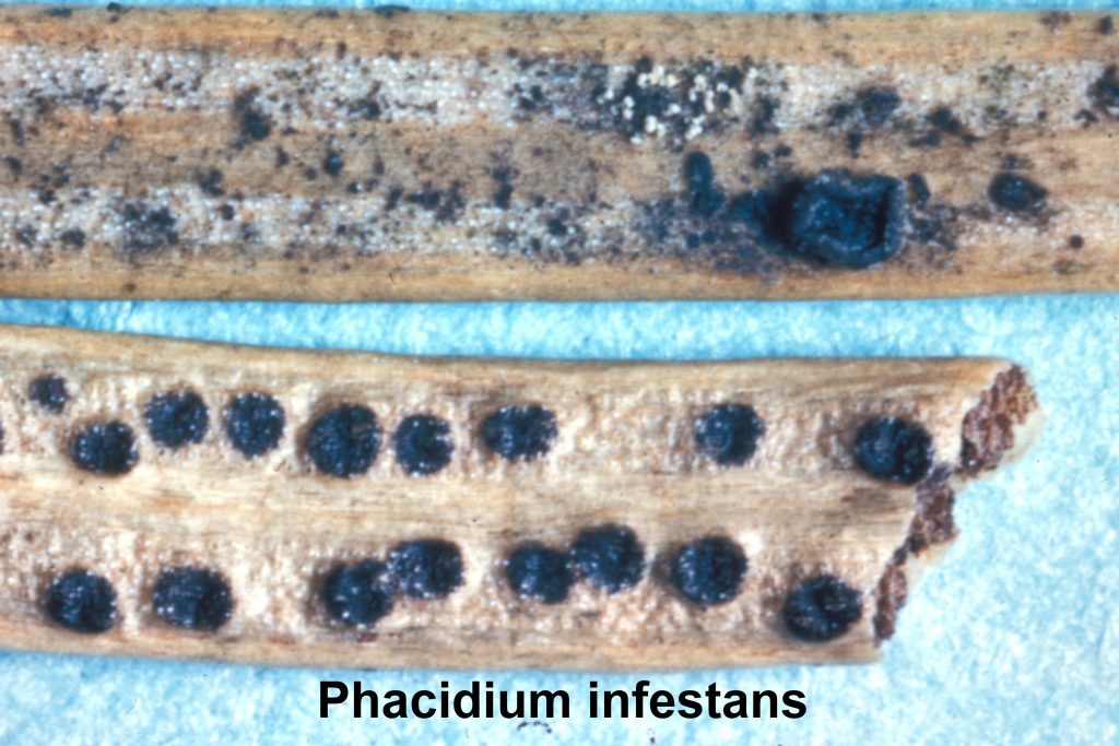 🟡Шютте снігове. Збудник – гриб Phacidium infestans. Після танення снігу – хвоя на гілках, які знаходилися під снігом, набуває червоно-бурого забарвлення. Влітку уражена хвоя світлішає, стає бежево-сірого або сіро-зеленого забарвлення. До кінця літа на ній формуються невеликі темнозабарвлені горбочки діаметром 0,6-1,3 мм – апотеції (сумчасте спороношення). Уражена хвоя міцно тримається на пагонах і (на відміну від попередніх видів шютте) не осипається. Розвиток гриба відбувається тільки за наявності глибокого снігового покриву. Тому цей патоген найбільшу небезпеку становить для сіянців, саджанців та молодих дерев.