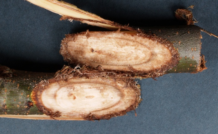 🔸Гостра форма характеризується швидким розвитком – протягом кількох місяців після зараження. Відбувається суттєве ослаблення дерева, або навіть загибель садивного матеріалу та підросту. Основними ознаками є: скручування листя та зміна його забарвлення від жовтуватого до бронзового відтінку, швидке в’янення гілок по всій кроні та передчасна дефоліація. На розрізах гілок ураженого дерева помітні бурі плями, кільця, а іноді і побуріння всієї заболоні, причиною чого служать гіфи гриба що закупорюють судини дерева